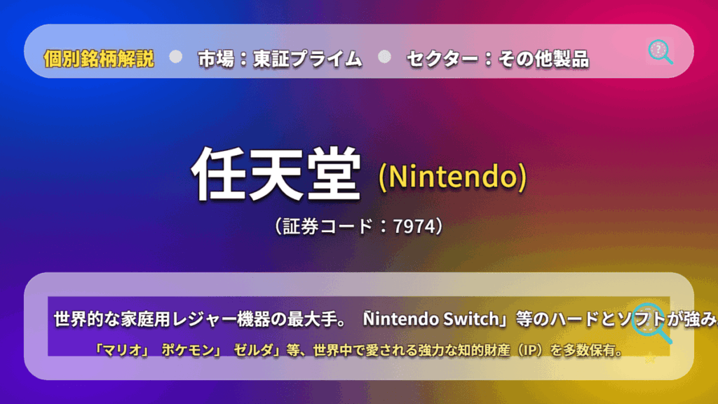 世界屈指のIP資産を持つ任天堂(7974)を徹底分析。Switchの次世代機への期待、映画・テーマパーク等によるIPの多角化戦略、そして無借金経営に裏打ちされた盤石な財務基盤を解説。 -