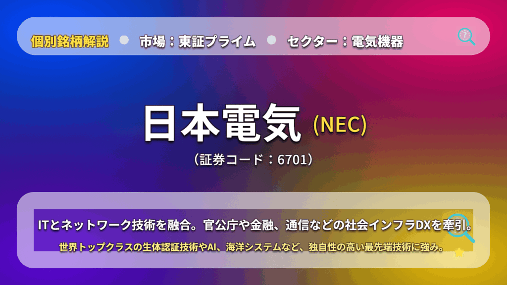 日本を代表するIT巨人、NEC(6701)を徹底分析。世界No.1の生体認証技術、世界シェア3強の海底ケーブル事業、そして国内ITサービスの強固な基盤と生成AIへの期待を解説。 -
