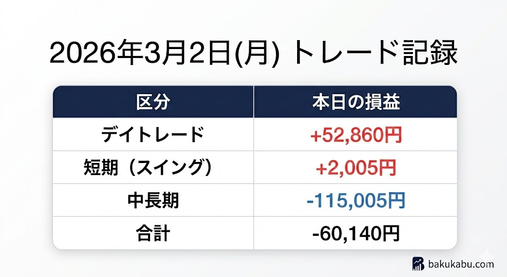 2026年3月2日(月) トレード記録:キオクシア11回転で勝率100%、中長期のリベンジ損切りも決行