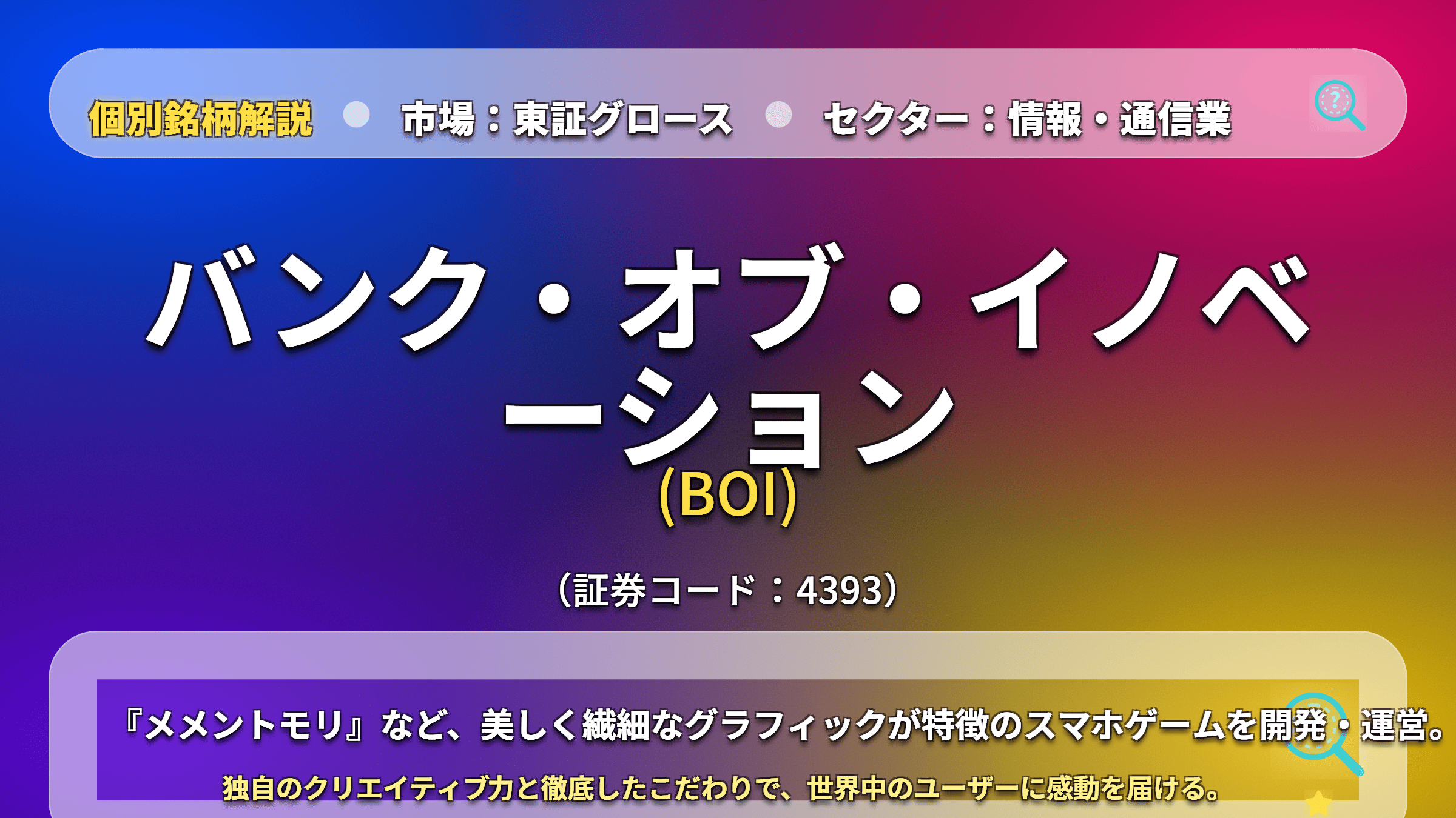 バンク・オブ・イノベーションは、特定タイトルへの依存というリスクを抱えつつも、それを補って余りある「圧倒的な稼ぐ力」を証明しました。ゲームセクターの中でも独自の世界観を確立しており、次なる新作や海外展開の進展次第では、再び市場の主役に躍り出る可能性を持っています。グロース市場らしいダイナミックな成長を期待する投資家にとって、目が離せない銘柄です。