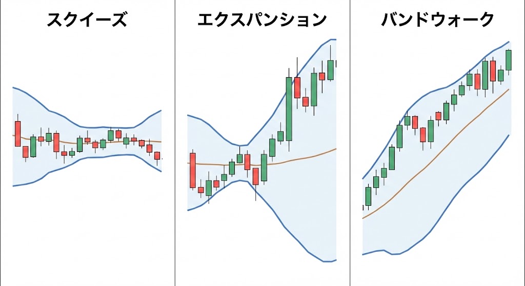 バンドの幅がキュッと狭まっている状態。市場がエネルギーを蓄積している「嵐の前の静けさ」です。スクイーズが長ければ長いほど、その後の爆発は大きくなります。