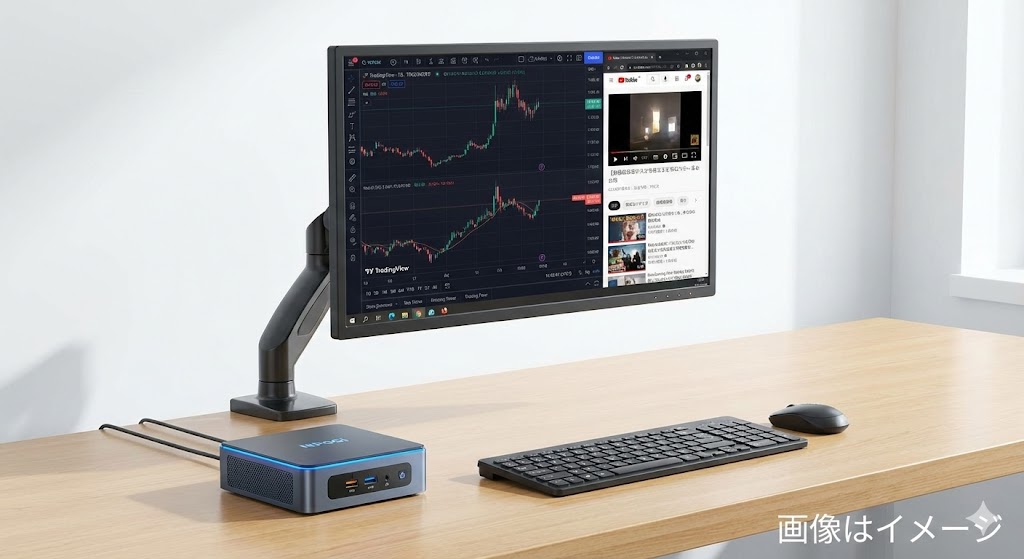 メイン機とモニターをつなぐだけでもマルチモニター(2画面)化はできるためミニPCは正直無くてもいいが、ノートPCとモニターを配線でつなぐのが嫌※だったのでデスクトップ的な構成にした。