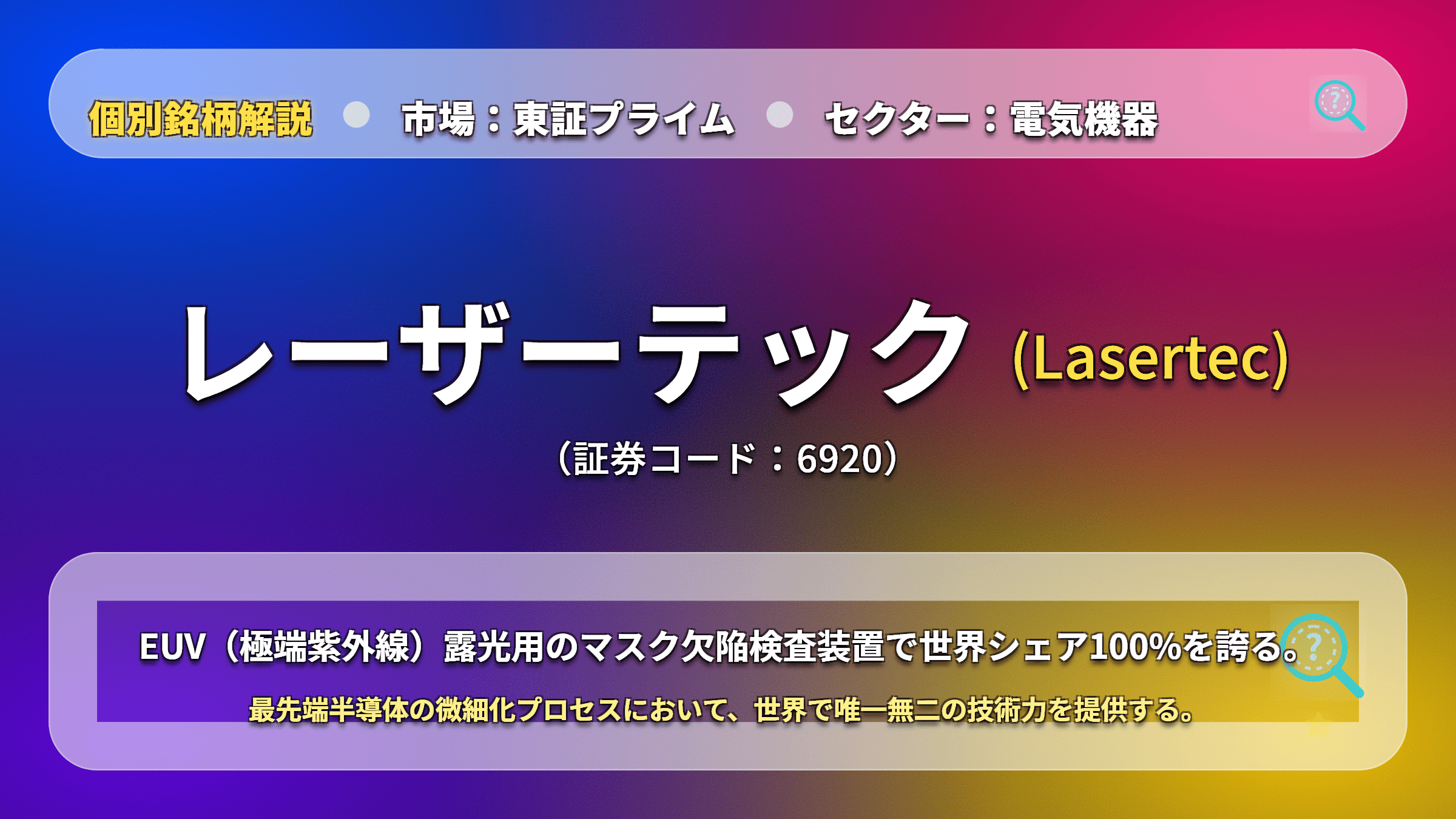 レーザーテックは、単なる半導体関連株ではなく、人類のコンピューティング能力の進化を支える「唯一の門番」です。株価のボラティリティ(変動幅)は大きいものの、世界シェア100%という圧倒的な堀を持つ同社は、長期的な資産形成においてハイテク枠の核となり得る銘柄と言えるでしょう。