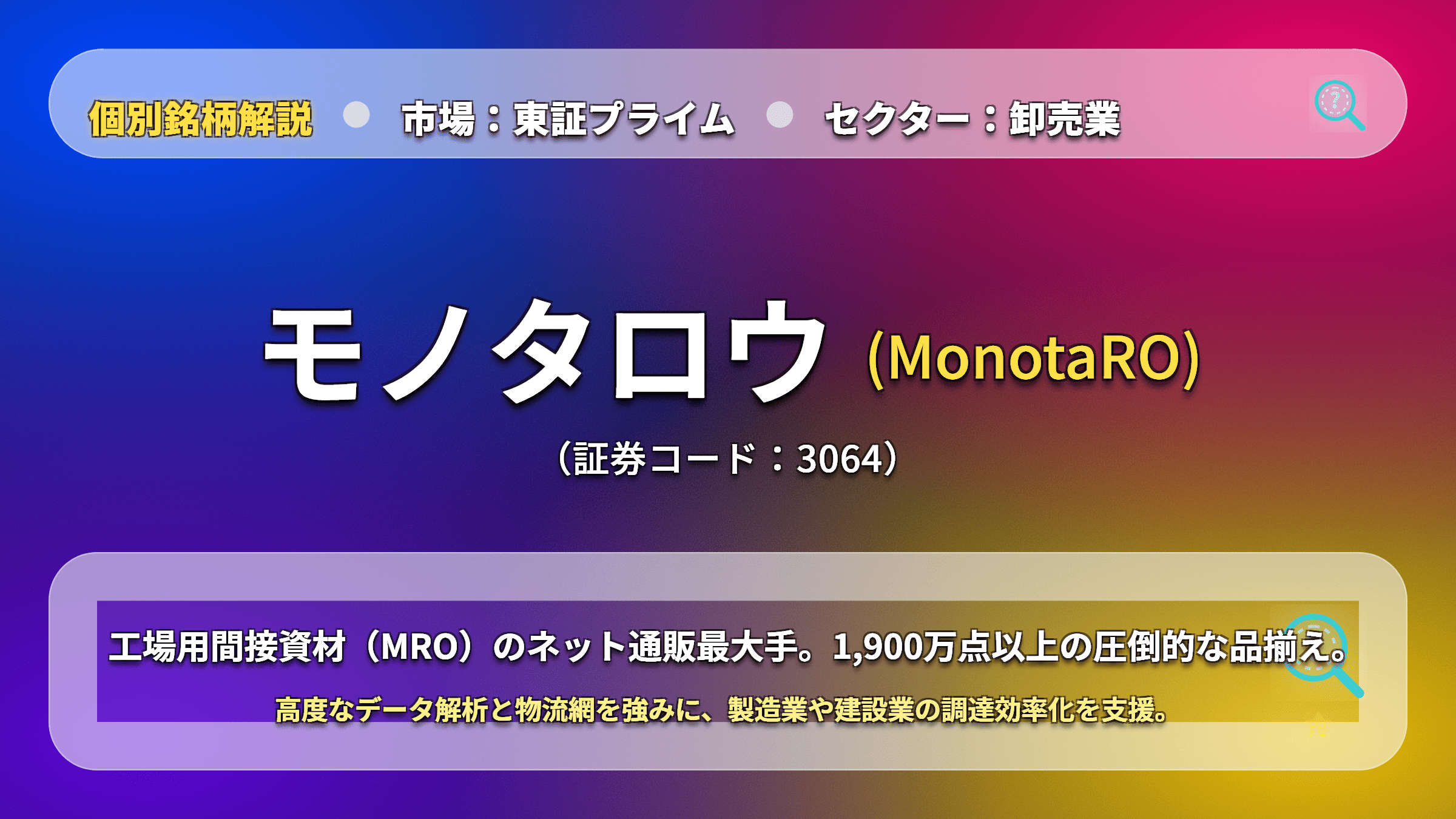 東証プライム市場において、EC(電子商取引)の力で巨大なBtoB市場を切り拓くモノタロウ(3064)。独自のデータ活用と圧倒的な物流網を武器に、高成長・高収益を維持するクオリティ・グロース銘柄です。
