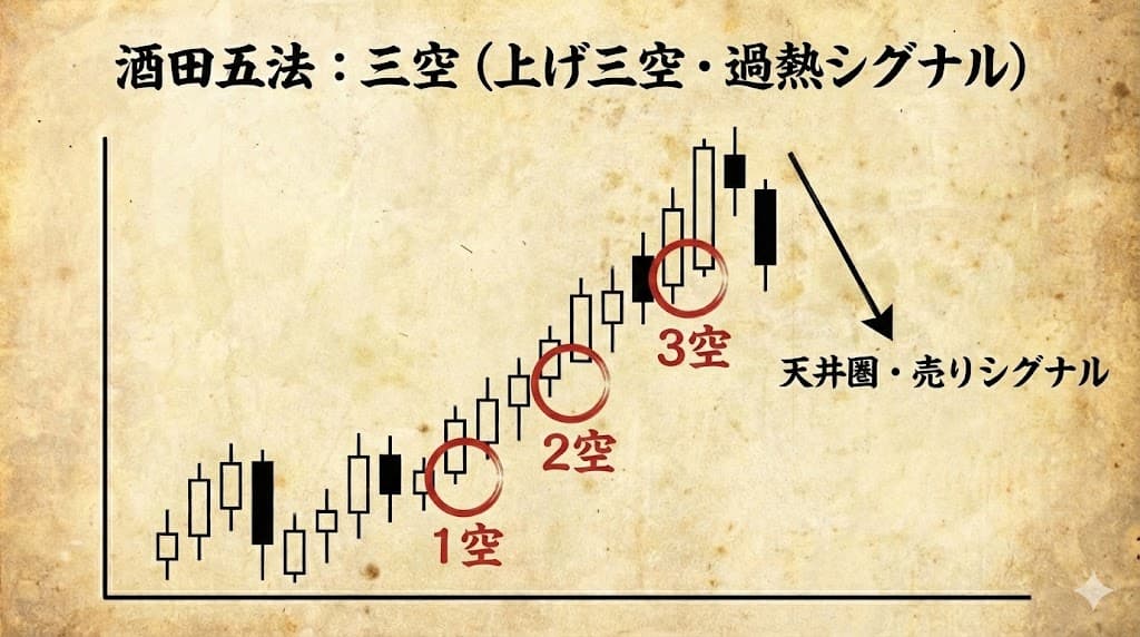 相場の勢いが加速しすぎて、投資家の心理が極限の熱狂(または恐怖)状態にあることを示唆する。「三空踏み上げには売り向かえ」という言葉通り、三つ目の窓が開いた後はエネルギー切れによる急反転が起こりやすい。上げ三空は「利食い・売り」下げ三空は「絶好の買い」を検討すべき大転換のシグナル。