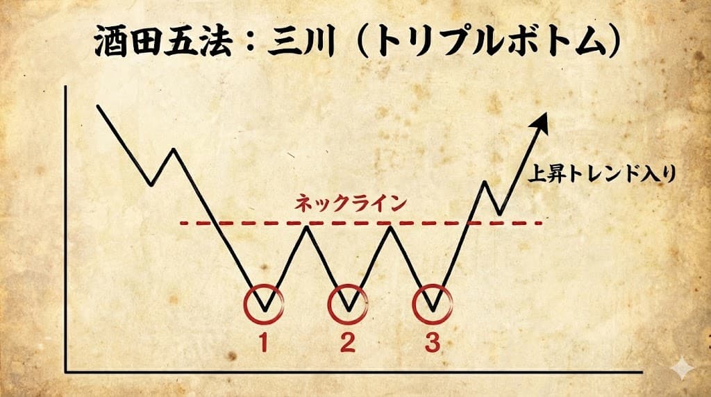 下落相場の安値圏で、三つの谷(底)が形成される形。三度下値を試したものの、それ以上は下がらずに踏みとどまった「不屈の底がた意」を指す。現代のチャート分析では「トリプルボトム」や、中央の谷が深いものは「逆三尊」と呼ばれる。