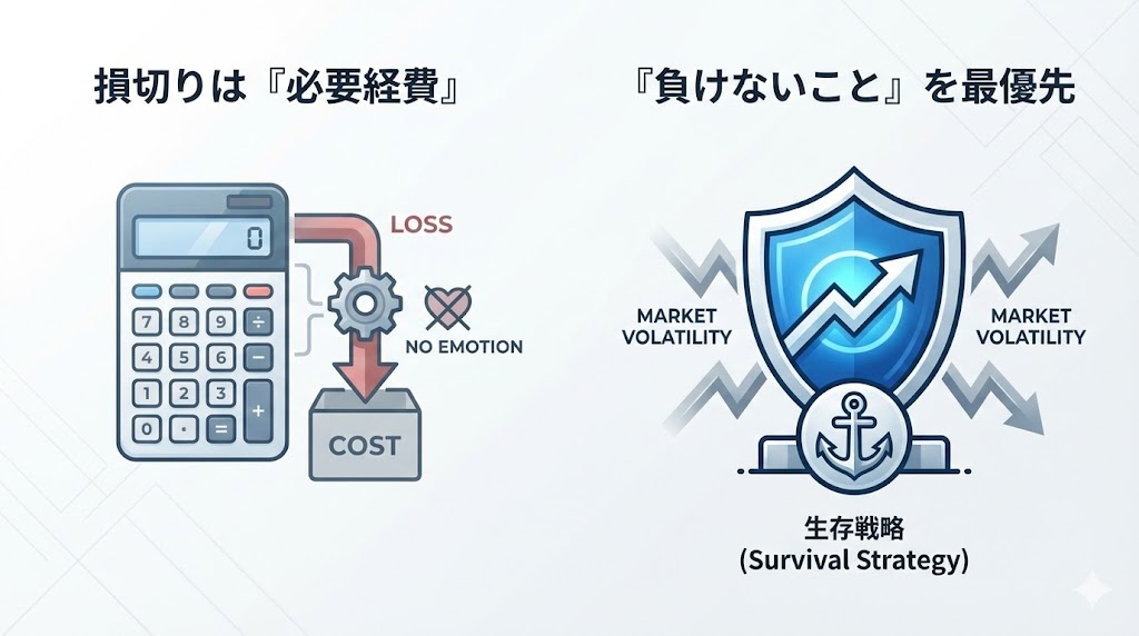 - 損切りは「必要経費」:利益を出すために避けて通れないコストと定義し、感情を入れずに執行します。