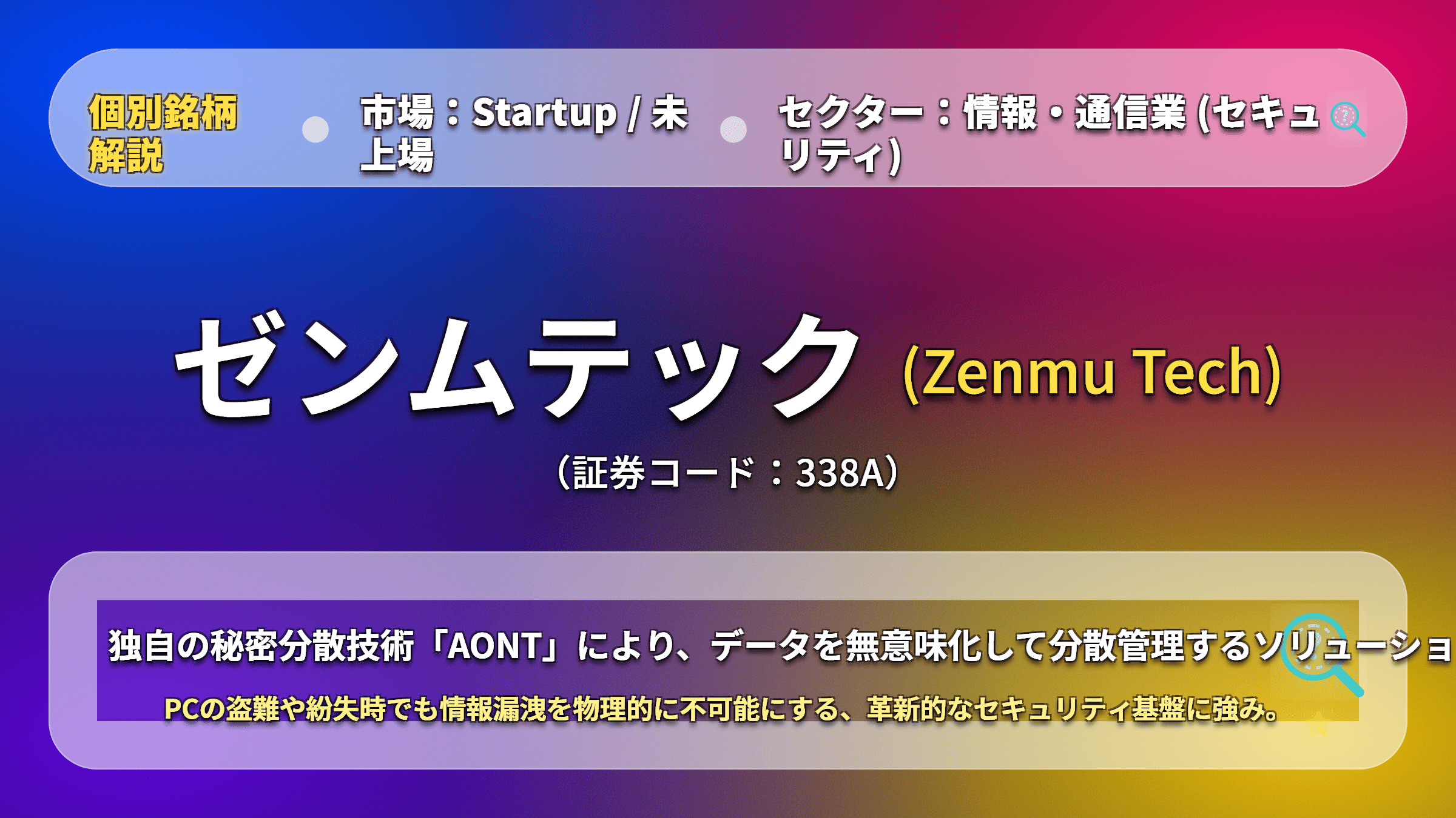 東証TOKYO PRO Marketに上場し、独自の秘密分散技術「ZENMU」を展開するゼンムテック(5241)。「暗号化」の先を行く「無意味化」というアプローチで、企業のデータ資産を守る次世代のセキュリティ・リーダーです。